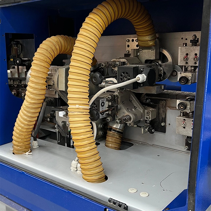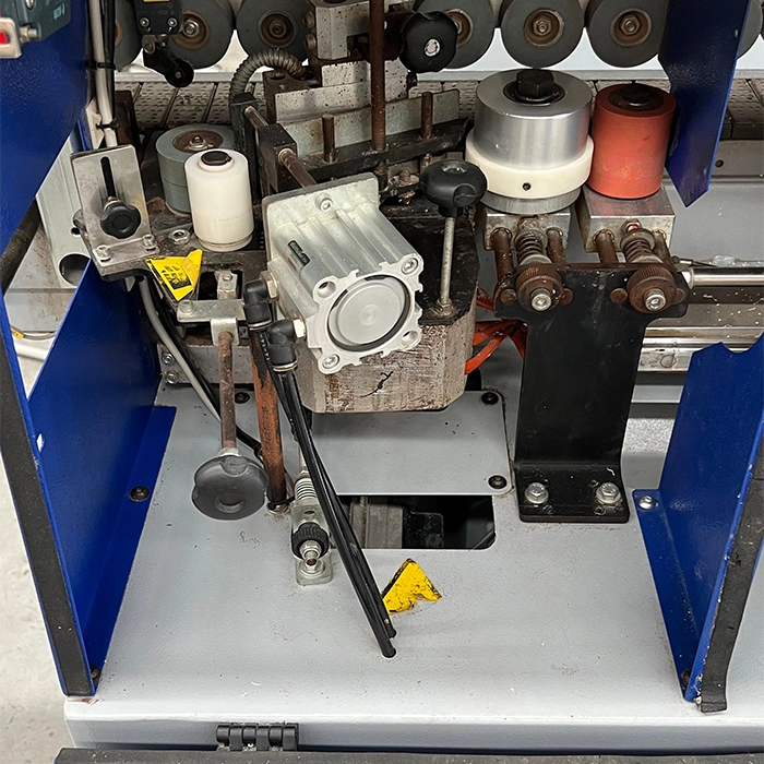 Equipo compacto para enchapado de cantos en tableros, utilizado en talleres pequeños o espacios reducidos.