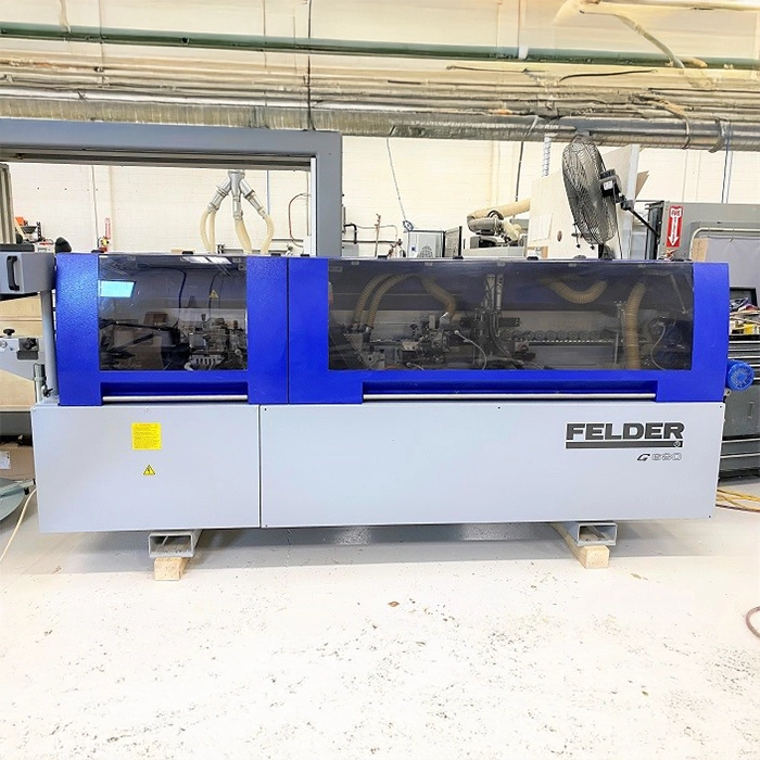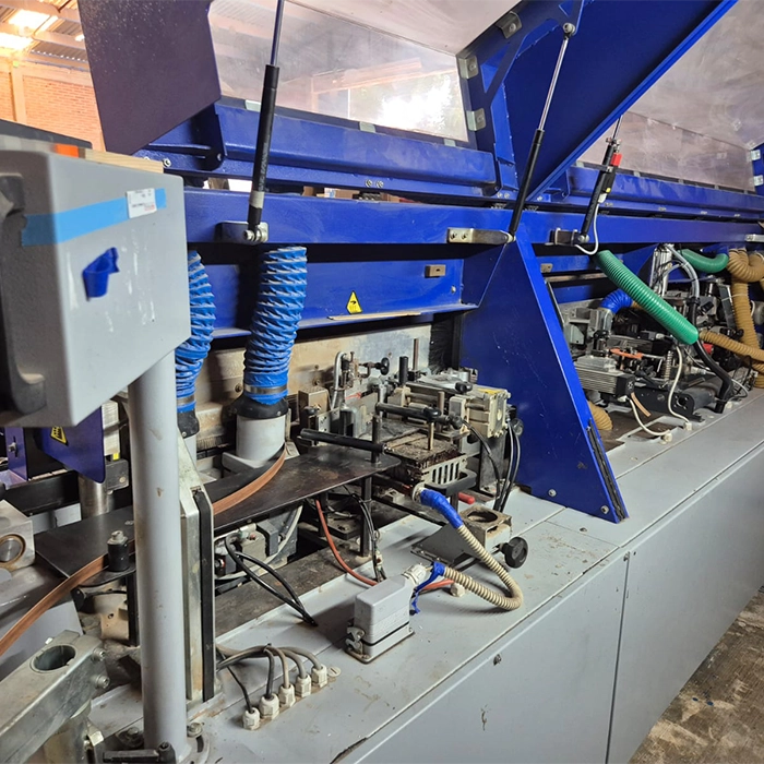 Equipo para enchapado de cantos en tableros, orientado a trabajos continuos en carpintería.